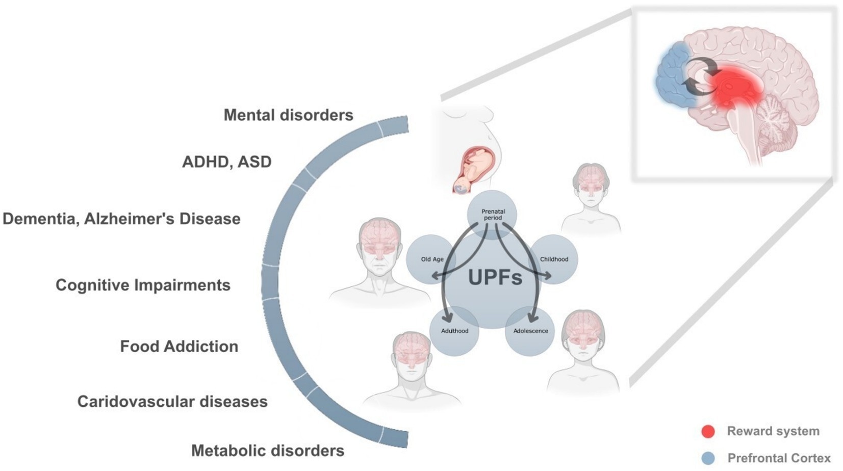 The lifelong and intergenerational impact of ultra-processed foods (UPFs) on health and neurodevelopment. This figure illustrates the profound and cumulative effects of UPF consumption across different life stages, prenatal period, childhood, adolescence, adulthood, and old age, highlighting their role in a broad spectrum of neurodevelopmental, metabolic, cardiovascular, and cognitive disorders. The interconnected arrows emphasize how exposure to UPFs in one stage can amplify health risks in later stages, creating a continuous and reinforcing cycle of adverse health outcomes.The lifelong and intergenerational impact of ultra-processed foods (UPFs) on health and neurodevelopment. This figure illustrates the profound and cumulative effects of UPF consumption across different life stages, prenatal period, childhood, adolescence, adulthood, and old age, highlighting their role in a broad spectrum of neurodevelopmental, metabolic, cardiovascular, and cognitive disorders. The interconnected arrows emphasize how exposure to UPFs in one stage can amplify health risks in later stages, creating a continuous and reinforcing cycle of adverse health outcomes.