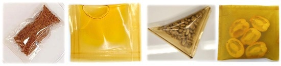 Examples of edible pouches for instant coffee, oil, seeds and dried cherry tomatoes