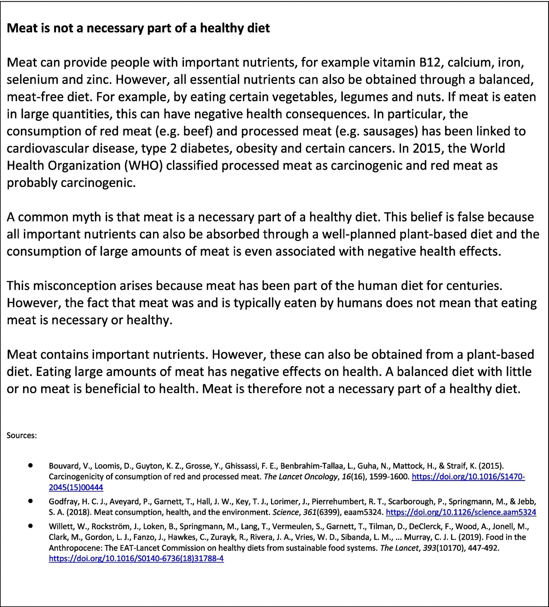 The study was conducted in two parts: 1. A preliminary study (n = 1,005; 496 women) to identify widely prevalent meat-associated myths, and 2. The main longitudinal experiment (n = 537; 263 women). The latter cohort was randomly subdivided into one of three groups. Two groups read a "truth sandwich" text specifically designed to debunk either the health myth or the environmental myth. The third group read a neutral control text about healthy eating.