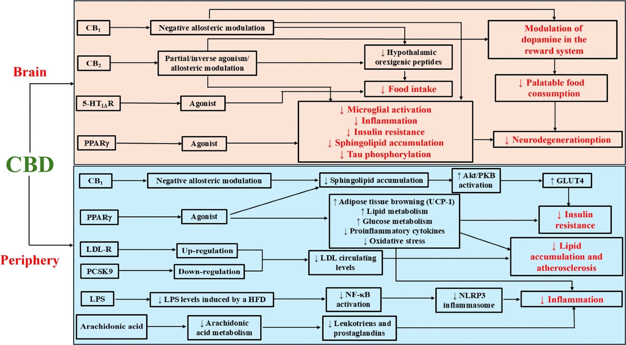 Overall, CBD shows promise for reducing food intake, improving glucose and lipid metabolism, and exerting anti-inflammatory and neuroprotective effects in preclinical studies. However, translation to humans remains incomplete.
