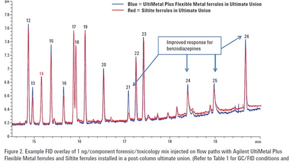 The experiment showed that Agilent Ultimetal Plus Flexible Metal ferrules show an improvement in the peak shape and response analyzing a forensic/toxicology check mix when compared to the Siltite ferrules. Benzodiazepines in the mix showed best improvements.