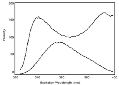 Figure 5 shows the fluorescence excitation spectra of two adjoining Fura-2-loaded cells acquired with the PTI ImageScan.