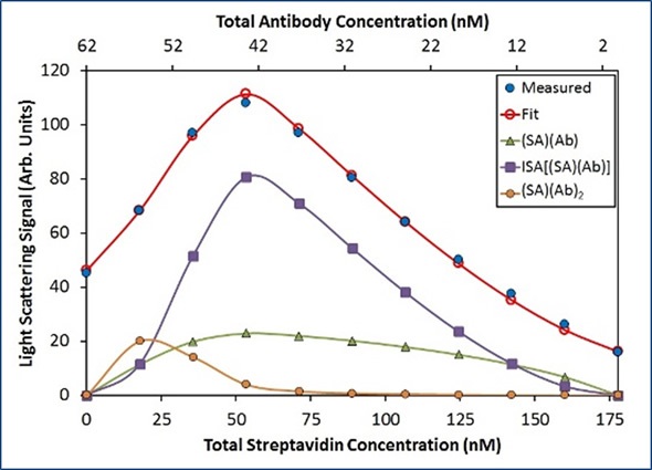 In Figure 5, the best fit (red unfilled circles) for the measured light scattering data (blue filled circles) shows contributions from ISA, (SA) (Ab), and (SA)(Ab)2 species. The purple squares show the overall contribution to the model by all species with stoichiometry [(SA)(Ab)]n with n>1.