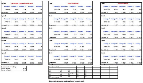 The signal-to-noise ratio calculated for the 96-well black and white plate was 192000:1, compared with 178000:1 for a white plate. This demonstrates a useful 7.5% increase in detectable signal over the background. For wells closest to the reaction mixture (Cells X1), the calculated cross-talk was just 0.026% in the black and white plate, compared with 0.048% and 0.041% in the other two solid white plates, which translates as an 82% improvement.