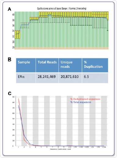 The genomic positions of modified chaperones, histones, nucleosomes, DNA-binding enzymes and TFs are determined by computational mapping of the sequenced DNA to gain insights into the contribution of these protein-DNA interactions in gene expression as well as in other cellular processes (Mardis et al, 2007). Figures 4A, B and C show the FastQC values for the sequencing run and the further duplication levels acquired for ERα.
