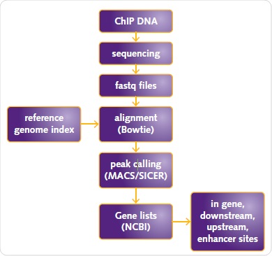 Figure 5. ChIP-seq data analysis workflow. ChIP DNA sequencing fastq files alignment (Bowtie) reference genome index peak calling (MACS/SICER) Gene lists (NCBI) in gene, downstream, upstream, enhancer sites.
