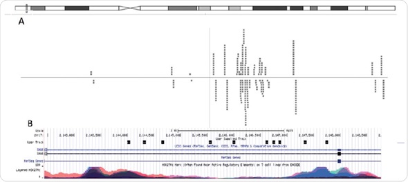 Figure 6. Graphical visualization of read alignment. When aligned to the genome using Bowtie software, MACSidentified peaks can be visualized through genome-browsers. (A) Chipster genome browser view of the chromosomal locus near the SMG6 gene. The dashed lines represents reads, which align to the reference genome that are associated with H3K4me3. (B) UCSC genome browser view of the same chromosomal locus overlayed with H3K27Ac ENCODE data.