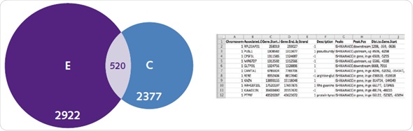 Compilation of genes belonging to specific treatment groups results in a database, which consists of data about genomic loci, function of the gene, the beginning and ending position of the gene and whether the peak is observed downstream, upstream or inside the gene itself (Figure 7). Most of the genes related to the E2 group are associated with metabolic pathways and cell proliferation.