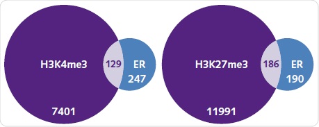 Figure 8. ER recruitment and the histone methylation landscape. The number of genes associated with H3K4me3 (left) and H3K27me3 (right) when compared with ER binding under basal conditions. Each diagram shows the number of unique and commonly shared genes between each group.