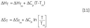 As Tm is the midpoint of enthalpy determination, the enthalpies determined in the DSC experiment can be applied to the Tm of measurement. ΔG is 0 at this temperature, and ΔS is designated as ΔH/Tm from Equation 4. It can also be said that ΔS is achieved through elimination, and not by measurement. The errors resulted from the ΔH and Tm determination can distribute into ΔS.