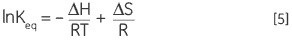 Given below is the van’t Hoff Equation obtained by combining and rearranging Equations 3 and 4. Based on Equation 5, it is possible to plot the differences in equilibrium constant against temperature to obtain the entropy and enthalpy of the thermal denaturation: