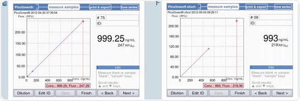 Result in the Biospectrometer using PicoGreen-“short” (2 Standards)