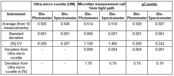 It can be seen from the µCuvette results that the values were in line with the expected results, and also with the measurements acquired with the ultra-micro cuvette. This means that the µCuvette has a lower deviation when compared to a competing microliter measurement cell. Such low standard deviations imply that the µCuvette can provide a high degree of precision in measurements.