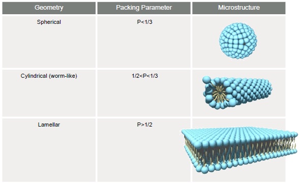 Based on theoretical concepts, researchers are now able to determine the effect of formulation conditions, such as the surfactant composition, pH, and the electrolyte level, on the microstructure of the WLMs. Surfactants are the most common source of WLMs. They are amphiphilic molecules and can organize themselves into various microstructures based on the surfactant packing parameter, as shown in Table 1.