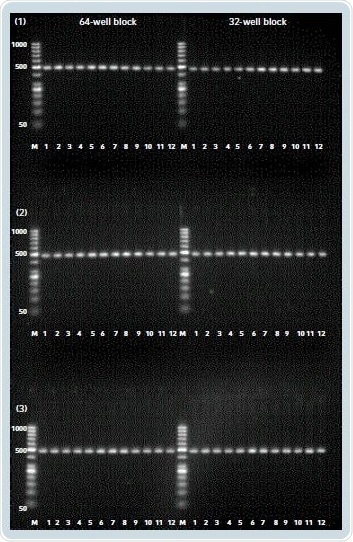 Three repeated PCR runs, where each PCR run had 12 samples, were utilized to test PCR result reproducibility procured from one block, and to compare the PCR products from the two well blocks (Figure 4a). Examination of the PCR product concentration, as measured on the 2100 Bioanalyzer using the Agilent DNA 1000 kit, reveals the reproducibility of the product yields on the 32-well and 64-well blocks (Figure 4b).