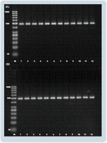 Figure 5. (A) Twelve PCR products of the 64-well block during a permanent holding temperature of 4°C on the 32-well block; (B) twelve PCR products of the 32-well block during a permanent holding temperature of 99°C on the 64-well block (M: Length marker, GeneRuler™ 50bp DNA Ladder, Thermo Fisher Scientific).