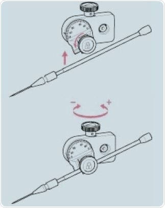 The application mask of ICSI can store about three positions. Two of these are reserved already (Pos. 1 and Pos. 2), while the third position can be programmed individually (Pos. 3). The joystick is to be pressed twice to reset the required position of the capillary (Figure 5) during the course of the ICSI process.