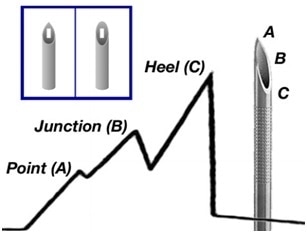 A unique bevel shape and silicone application technology are pivotal to attaining these patient comfort goals. Due to the “non sharp” point the ‘constant site cannulation’ device needs to be inserted at a pre-existing site tunnel.