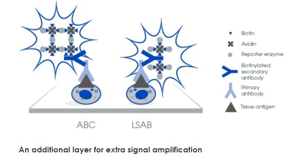 Tissue penetration Lower Higher The complex size in LSAB methods is smaller facilitating a greater tissue penetration.