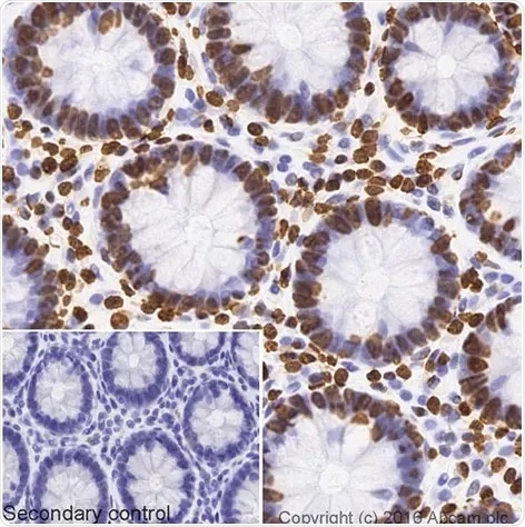 HC image of Anti-Histone H4 [EPR16599] – ChIP Grade RabMAb antibody (ab177840) staining in a section of FFPE human colon tissue. Goat Anti-Rabbit IgG H&L (Biotin) (ab207995) was used as the secondary antibody. Endogenous biotin was blocked using Endogenous Avidin/Biotin Blocking Kit (ab64212). Detection was via an HRP conjugated ABC system and DAB was used as the chromogen. The section was then counterstained with haematoxylin. The inset negative control image is taken from an identical assay without primary antibody. For further details, visit the datasheet here.