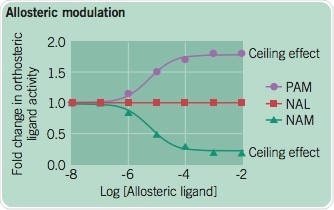 There are three different modes of behavior through which allosteric modulators are characterized: PAMs NAMs or NAL2. Heightening concentrations of different allosteric modulators are titrated against a single concentration of an orthosteric ligand. A key feature of allosteric drugs is the ‘ceiling effect’; beyond this concentration of the allosteric drugs, the modulatory effect is saturated.
