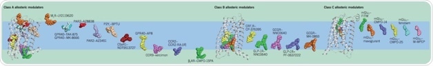 Diversity in the Binding Sites of Synthetic Allosteric Modulators across GPCR Classes. Chemical structures of allosteric modulators (colored spheres) mapped onto representative family members of class A (M2 mAChR, PDB: 4MQT), class B (GCGR, PDB: 5EE7) and class C (mGlu5, PDB: 4OO9) GPCRs (PDB protein database; rcsb.org).1