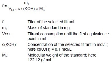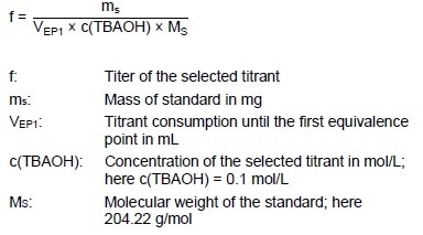 60 mL deionized water is added to around 180 mg KHP. The suspension is then stirred for approximately one minute to dissolve the KHP. Next, the solution is titrated until the first equivalence point using c(TBAOH) = 0.1 mol/L.