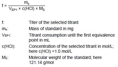 Approximately 420 mg TRIS is weighed into a titration vessel. 20 mL deionized water and 50 mL acetone are added. After a 20-second pause, the solution is titrated with c(HCl) = 1.0 mol/L until the first equivalence point. The electrode membrane is rehydrated for one minute in deionized water in between measurements.