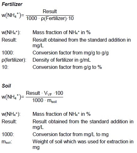A 0.5 mL prepared soil solution is pipetted into a 100 mL beaker and 49.5 mL water plus 1 mL c(EDTA) = 1 mol/L is added. The standard addition with β(NH4) = 100 mg/L is started immediately after the addition of 1 mL c(NaOH) = 10 mol/L.