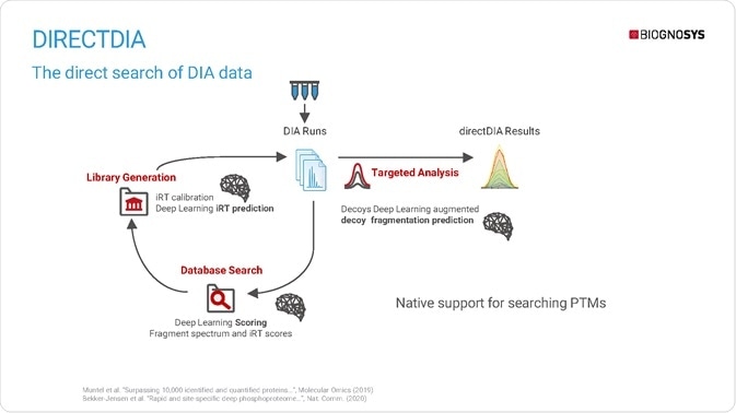 directDIA natively supports the searching of post-translational modifications, while deep learning predicts peptides' physical and chemical properties at different stages of the directDIA pipeline for fragmentation and retention time prediction.