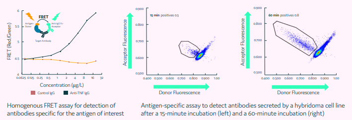 Using pairs of affinity probes, FRET assays can be utilized to directly identify the antibodies produced by a single cell. Antigen-specific assays can be applied with the use of a soluble antigen as one of the FRET assay probes.