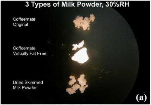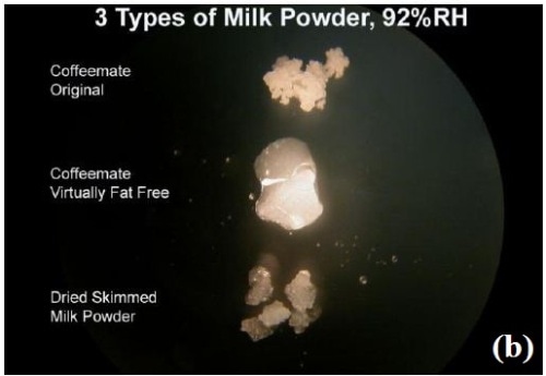 The similar dried samples of three different milk powders, namely Coffeemate Original, Coffeemate Virtually Fat Free, and freeze-dried, skimmed milk, were fed into the microscope slide in a fashion at right angle to the direction of gas flow. They were then subjected to varying humidity levels of 30% to 95% RH, and then at 95% RH for 80min.