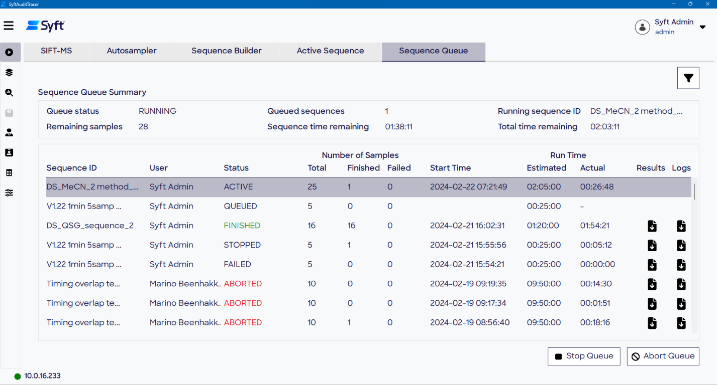 Figure 5. Active Sequence (top) and Sequence Queue (bottom) allow the progress of the current sequence and queued sequences, respectively, to be viewed. Image Credit: Syft Technologies