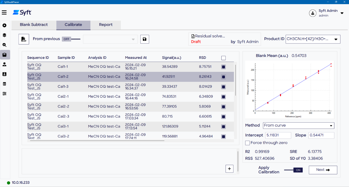 3. From previous: A calibration file from a previous analysis can be applied, where either 1 or 2 above have been selected for each product ion, respectively. Calibration files are controlled per the 21 CFR Part 11 standards applied to other files in SyftAuditTracer. For instance, it is not possible to edit or delete files.