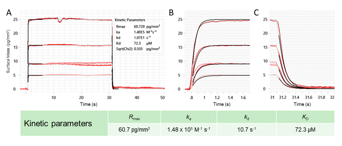 Grating-coupled interferometry (GCI) is a surface based, a label-free optical sensing technique used for real-time binding kinetic measurements.1 Typically, GCI is used to detect binding events between a target molecule and an analyte. When a protein immobilised on the sensor surface binds to an analyte, there is a light phase shift, which is read out interferometrically. The binding kinetics are analyzed by measuring these phase-shift signals in real time.