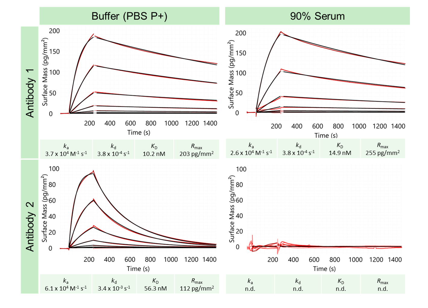 Results from analysis of two antibodies in buffer with and in 90% serum” (or if too long, Antibody profiling in 90% serum).
