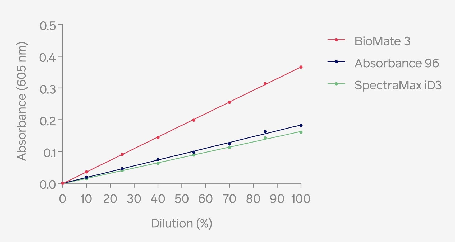 A study of OD measurements achieved using the Absorbance 96 plate reader was compared to the BioMate 3 photometer and SpectraMax iD3 plate reader.