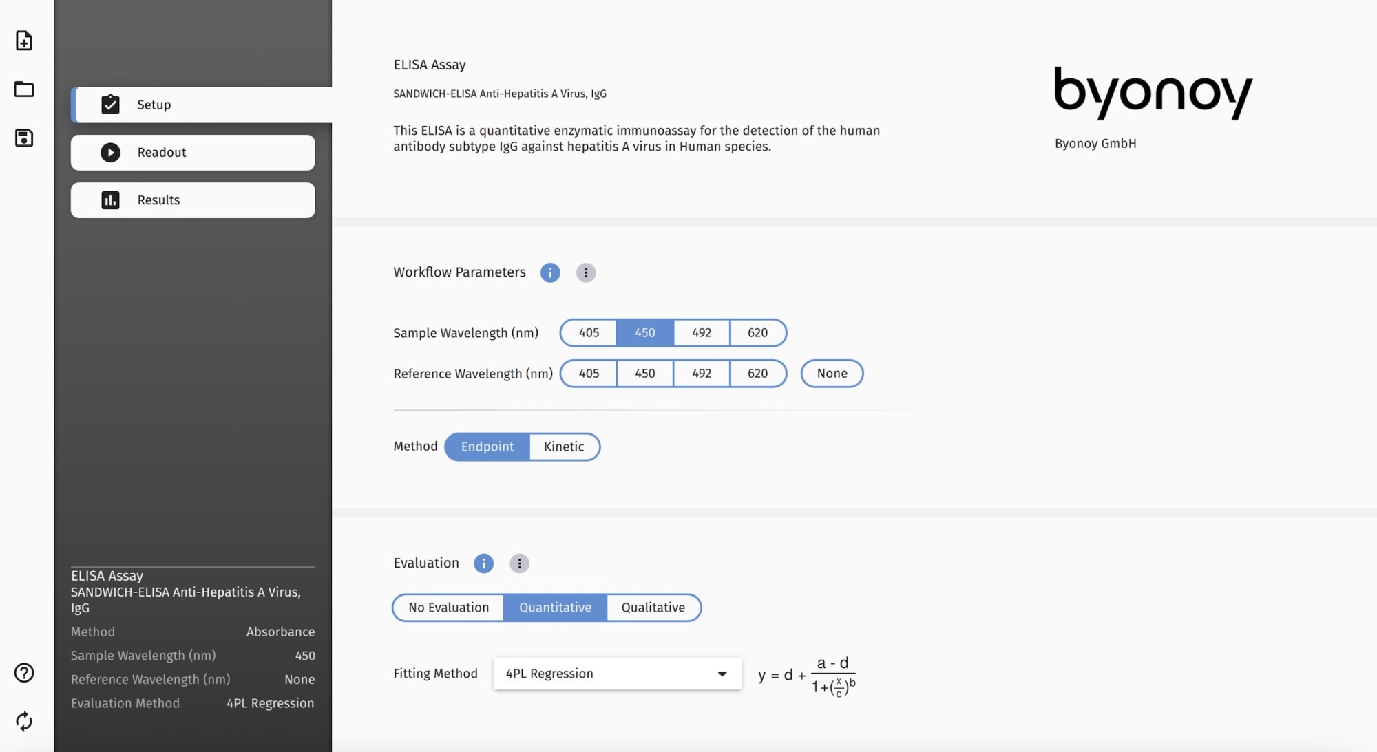 Figure 1. Assigning workflow parameters and evaluation methods for the ELISA assay is easy with the Absorbance 96 App. Image Credit: Byonoy