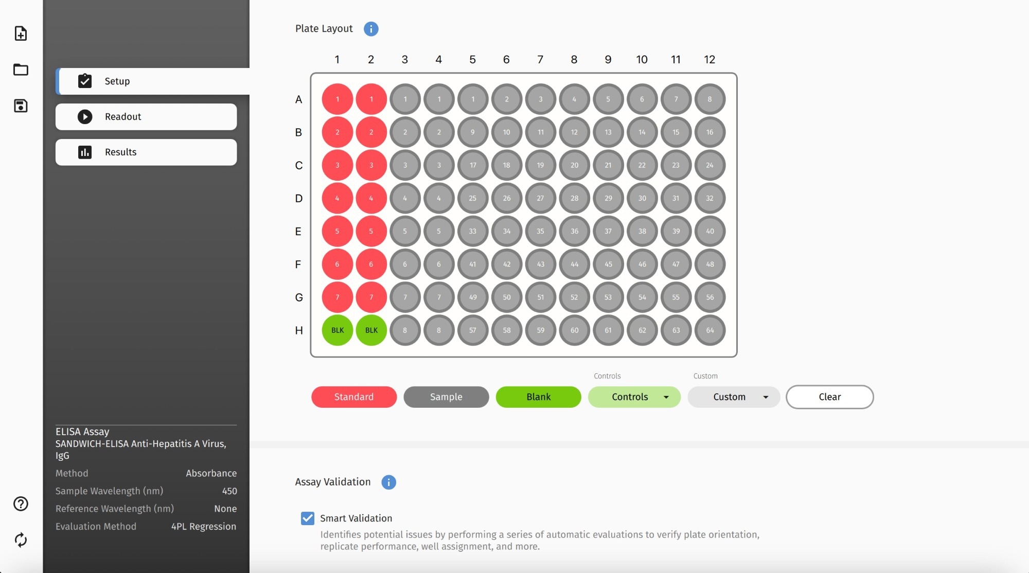 The click-and-drag interface helps users design plate layouts, choosing samples, controls, blanks, and standards as their favorite color labels. Duplication patterns can be set, assigning numerous copies for samples and standards. When conducting competitive ELISA, a specified well can be designated as a B0 control, and it is immediately calculated into the readout and data analysis.