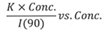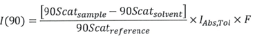 The following equation is used to quantify excessive Rayleigh light scattering intensity “I” at a 90° scattering angle: