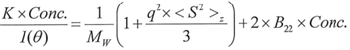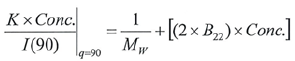 The Y-intercept is the same as 1/Mw of the molecule in the solution, and the plot’s slope is the same as twice the virial coefficient (B22) as shown in Figure 3.