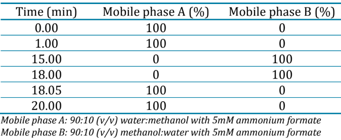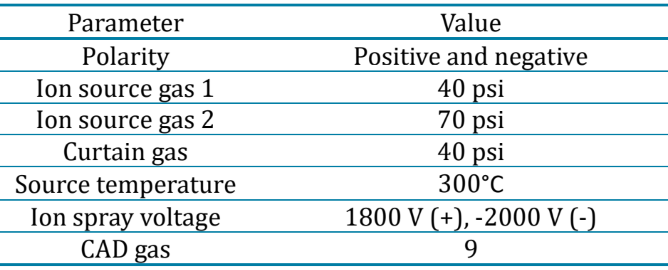 Mass spectrometry: Analysis was carried out utilizing scheduled multiple reaction monitoring (sMRM) with polarity switching on both systems. Table 2 displays the source and gas characteristics used in both systems.