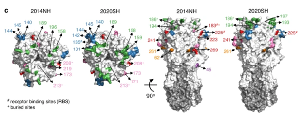 Figure 4. Key HA sites that changed between the 2014NH and 2020SH seasons, color-coded by epitope. Epitopes A and D are shown in the top view (left), and epitopes C, E, and unlabeled sites in the front view (right).8 Image Credit: Syed Awais W. Shah et al.